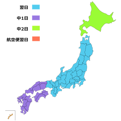 | 商品の引き渡し時期 | 【翌日配達】 青森県 秋田県 岩手県 宮城県 山形県 福島県 群馬県 栃木県 茨城県 埼玉県 千葉県 東京都 神奈川県 山梨県 新潟県 長野県 富山県 石川県 福井県 静岡県 愛知県 岐阜県 三重県 大阪府 京都府 奈良県 滋賀県 兵庫県 和歌山県 【中1日配達】 島根県 鳥取県 岡山県 広島県 山口県 香川県 徳島県 愛媛県 高知県 福岡県 佐賀県 長崎県 熊本県 大分県 宮崎県 鹿児島県 【中2日配達】 北海道 【航空便翌日配達】 沖縄県 ※郡部・離島につきましては中1-2日配達。 ![]() |